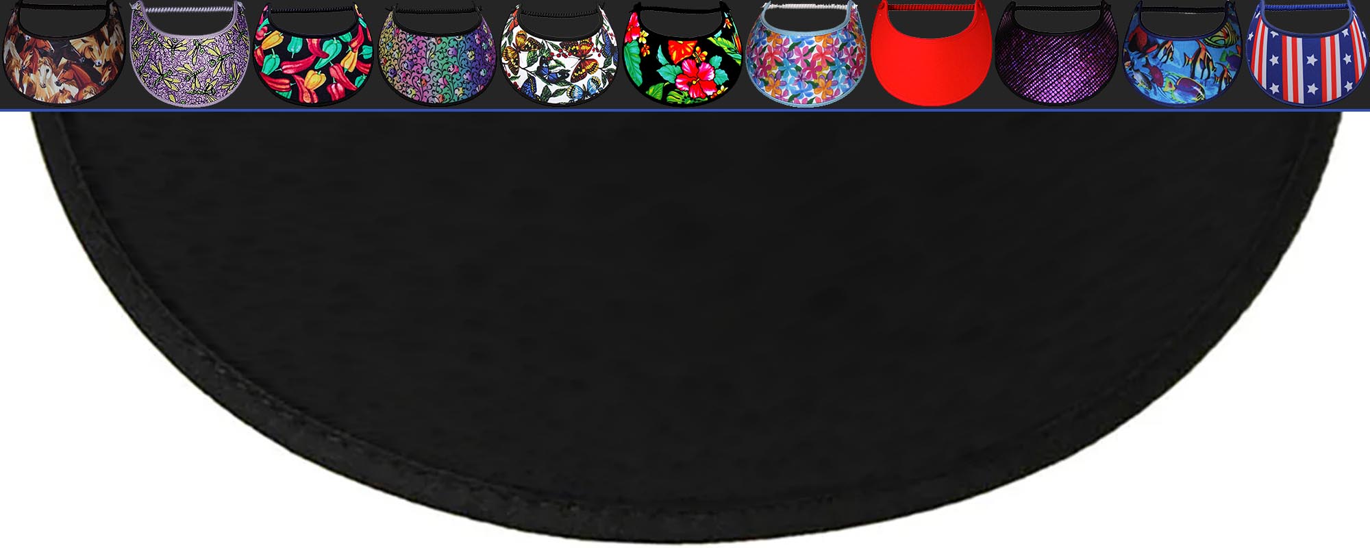 Where you can find the very finest quality sun visors in the widest variety of choices available anywhere! From patterns and vivid colors, to bling, to personalized creations to fit your needs, all with the customer's wishes in mind. Unlike other sun visor sites, each visor is bound along the edge to provide a more comfortable feel to the forehead and allows it to be machine washed without fraying.