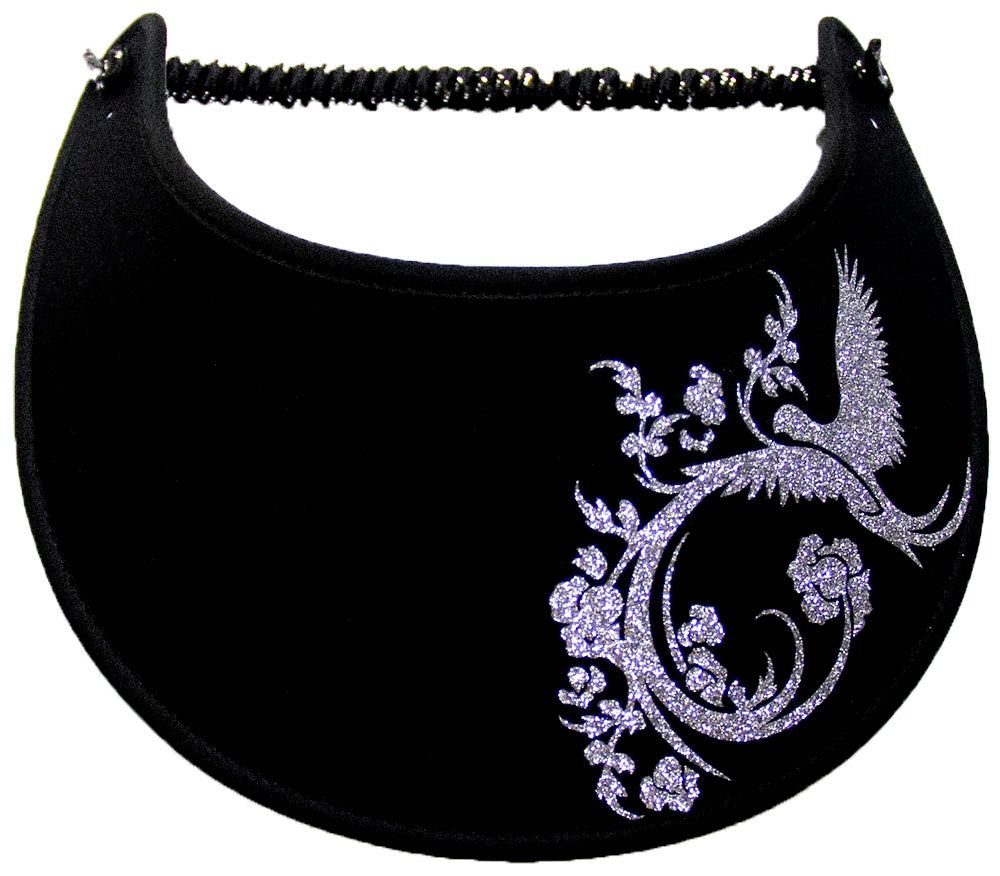 SILVER Glitzy Bird and Flower on Black Sun Visor